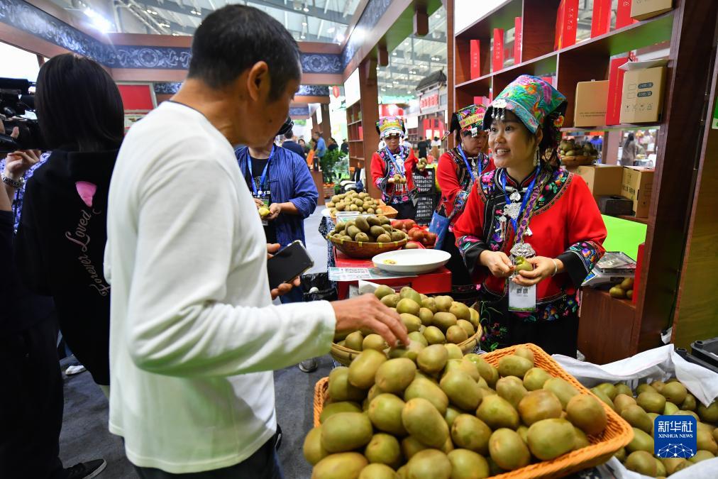 10月27日,在長沙國際會展中心舉辦的農博會現場,湘西蔬果展區的參展商向參觀者介紹獼猴桃。