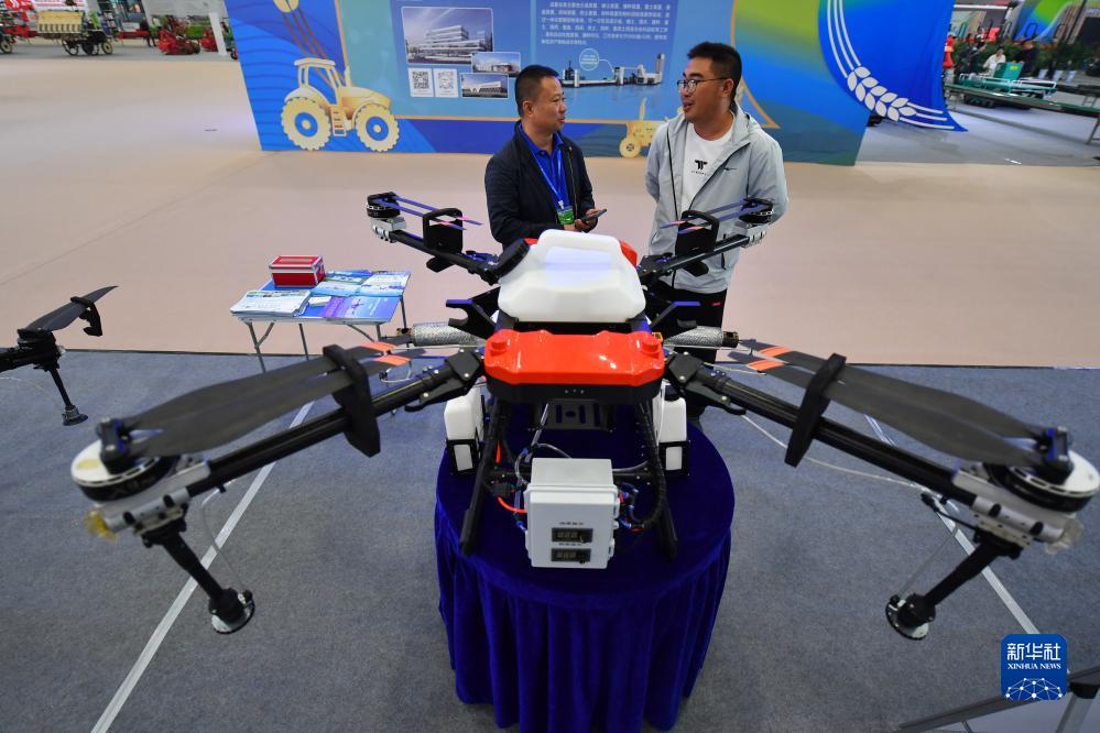 10月27日,在長沙國際會展中心舉辦的農博會現場,參觀者在了解一台農業無人機。