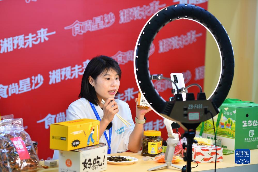 10月27日,在長沙國際會展中心舉辦的農博會現場,參展商在直播帶貨。