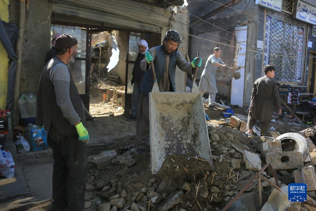 10月27日,在阿富汗首都喀布爾,人們在爆炸事件後清理磚瓦。