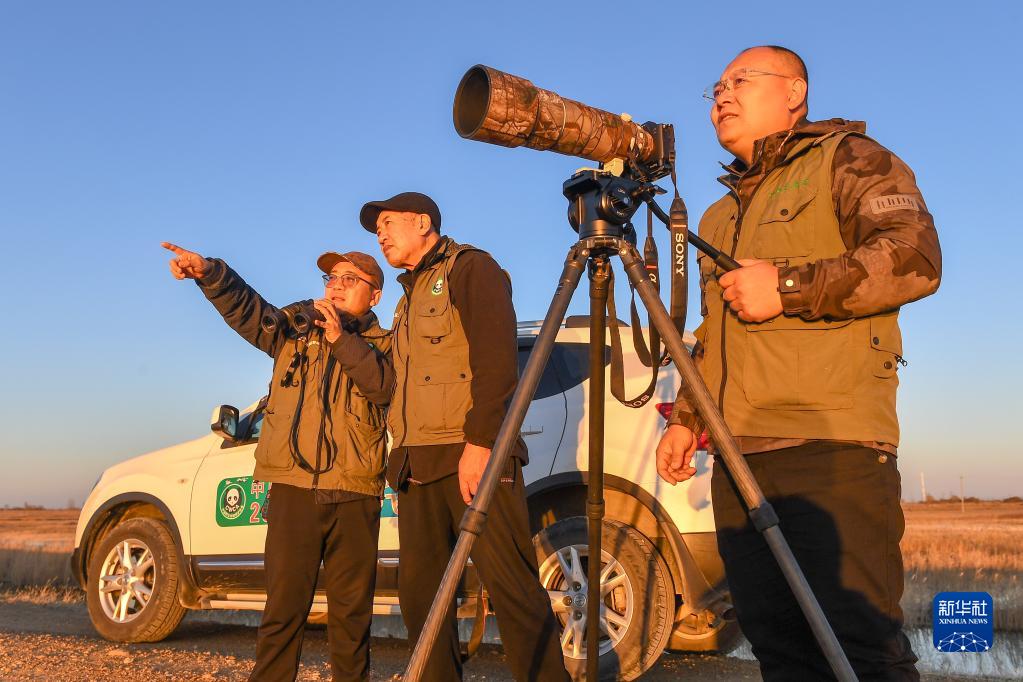 10月26日,中國野生動物保護協會吉林白城護飛隊隊員王岩(左)、張惠超(中)和姜海濤觀察、拍攝候鳥。