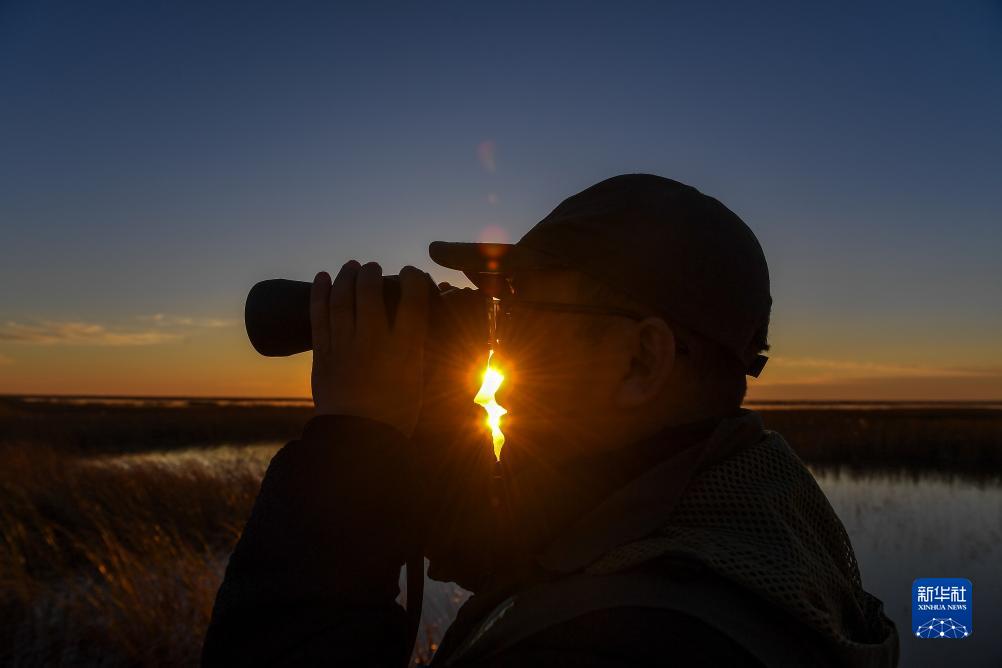 10月26日,中國野生動物保護協會吉林白城護飛隊隊員王岩觀察候鳥棲息狀態。