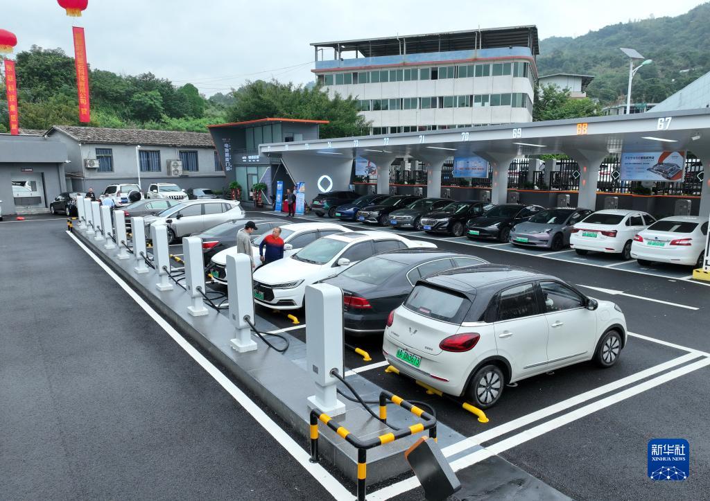10月27日,新能源汽車在福州市倉山區齊安路的齊安智檢超充站充電(無人機照片)。
