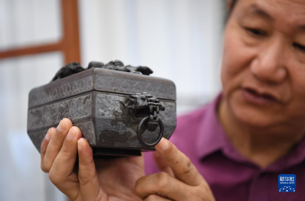 10月10日,在廣東肇慶柳新祥端硯藝術館,柳新祥講解“倣西周·簠形雙獅戲球套硯”的特點。