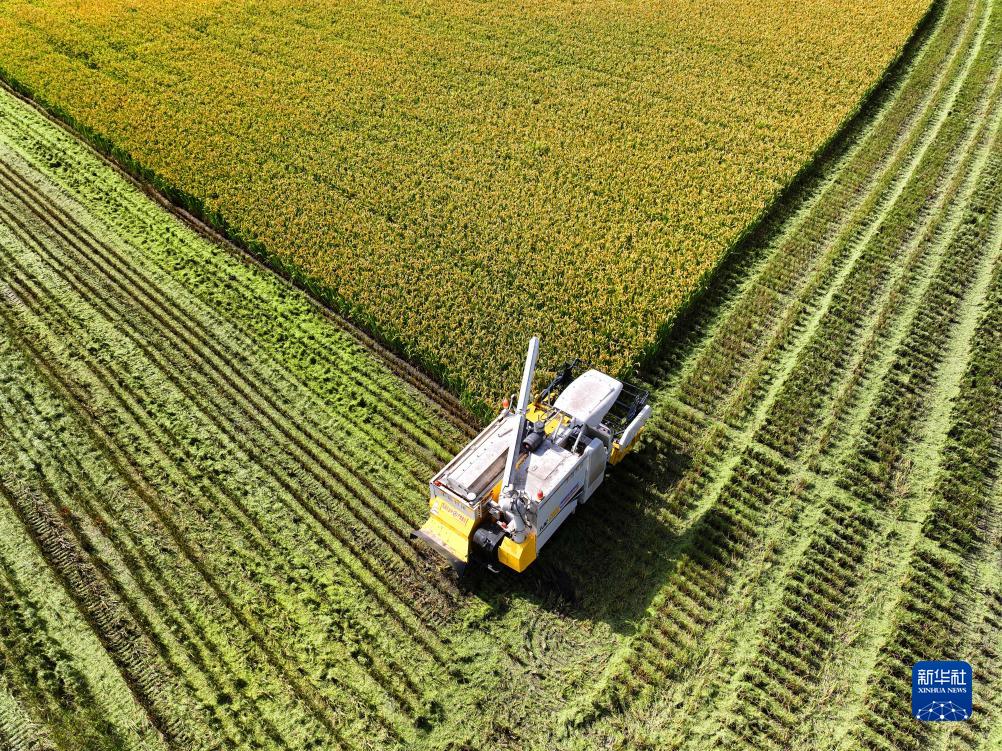10月27日,無人駕駛機械在江蘇省南通市通州區十總鎮育民村高標準農田收割水稻(無人機照片)。