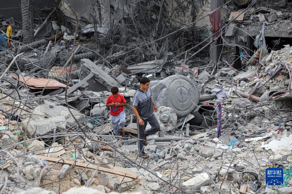 10月27日,在加沙地帶南部城市汗尤尼斯,人們查看建築廢墟。