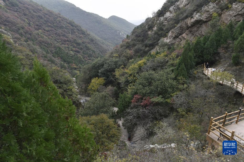 霜降節氣過後,位於河南省禹州市鳩山鎮的大鴻寨國家森林公園層林盡染,景色宜人,吸引游客前來登高觀景、賞秋拍照。