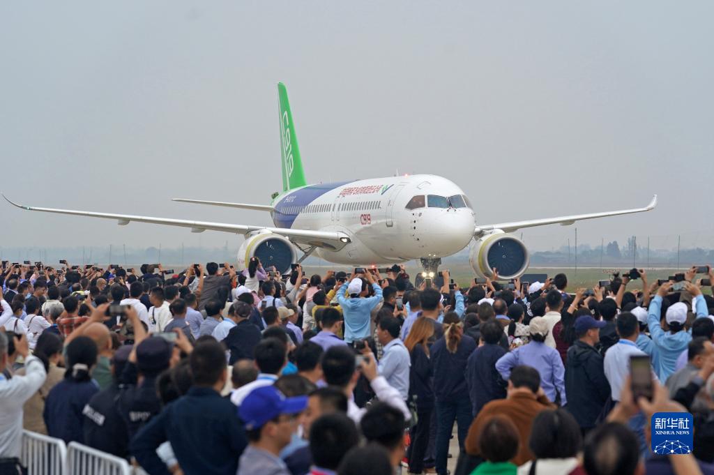 中國商飛C919大型客機從觀眾面前駛過(10月27日攝)。