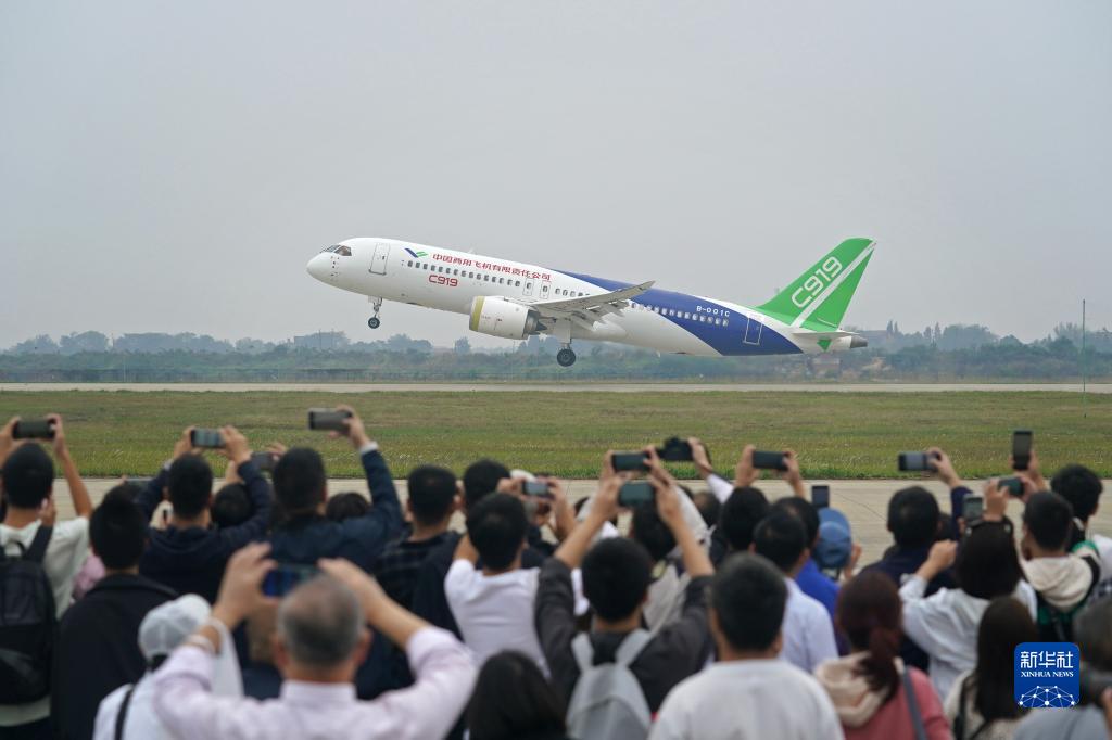 中國商飛C919大型客機在進行飛行展示(10月27日攝)。