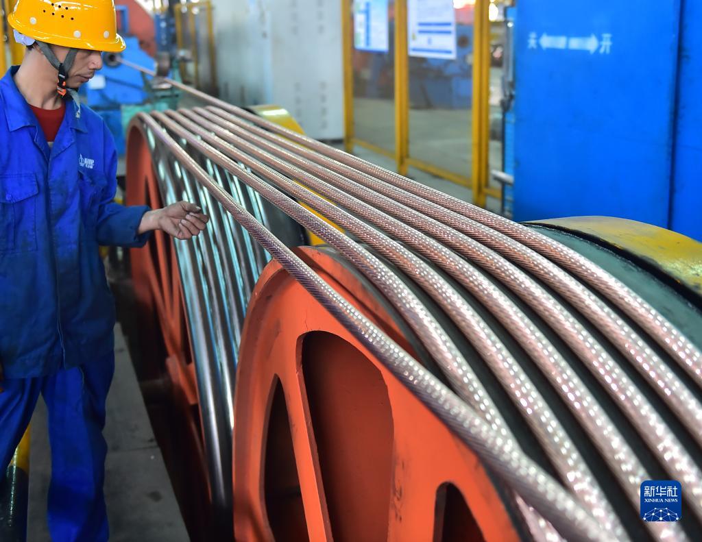 10月27日,技術工人在山東省聊城市陽谷縣漢河(陽谷)電纜有限公司生産車間電纜生産線上值守。