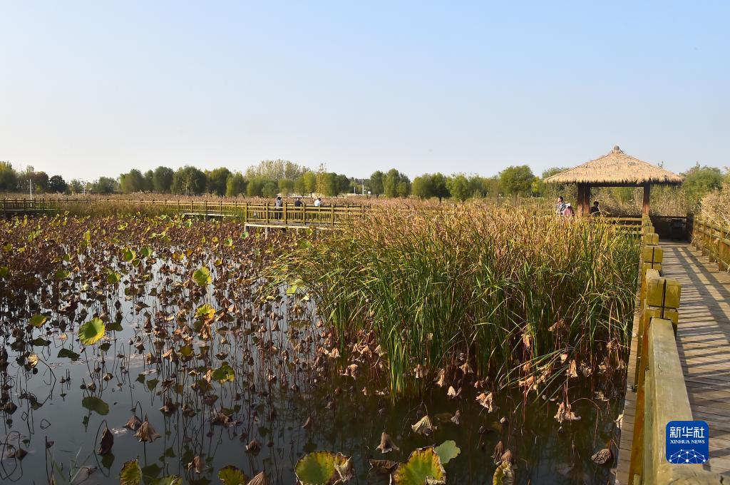 10月26日在山東省聊城市位山灌區拍攝的在引黃工程沉澱池區開發的位山黃河公園一角。位山灌區是黃河流域具有跨流域調水和生態保護功能的重要水利設施。