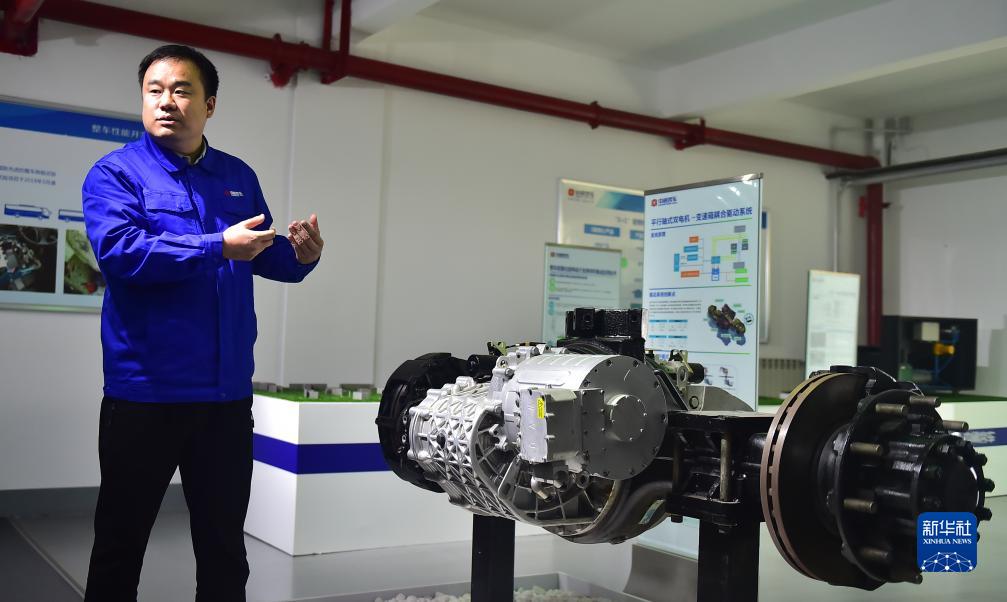 10月26日,山東省聊城市中通客車股份有限公司工作人員介紹中通客車研發的一款變速箱耦合驅動系統。