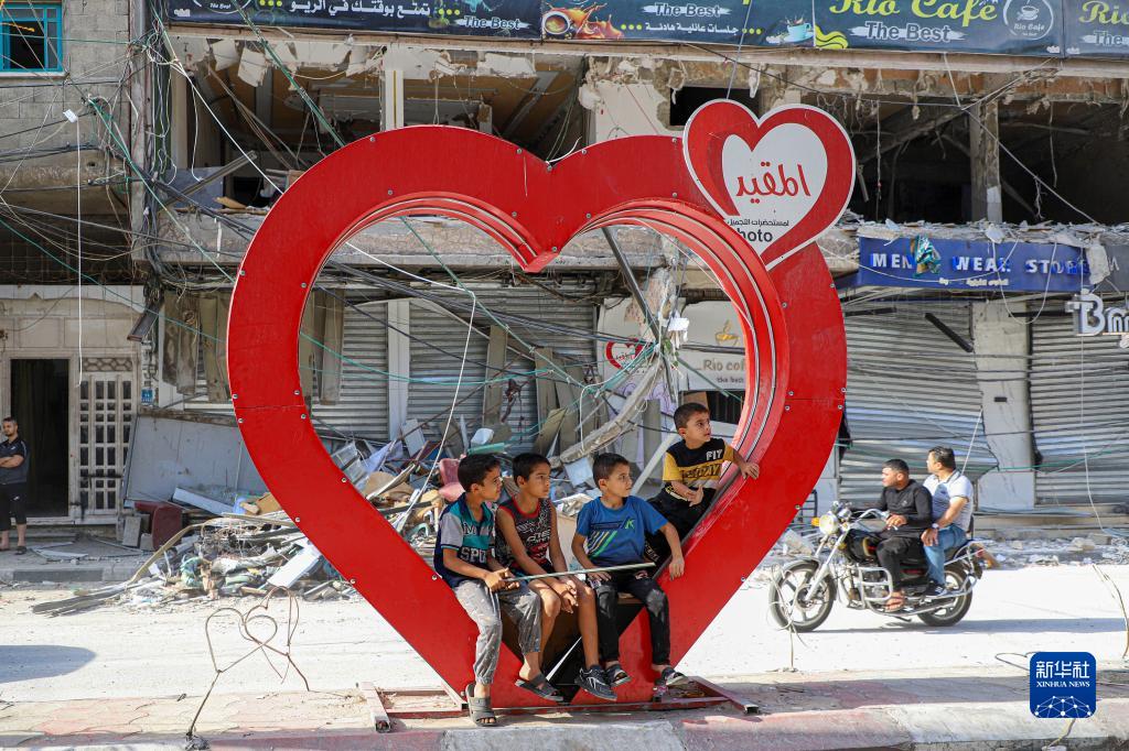 10月22日,在加沙地帶南部城市汗尤尼斯,幾名兒童坐在一處心形設施上,身後是遭以色列空襲損毀的建築。