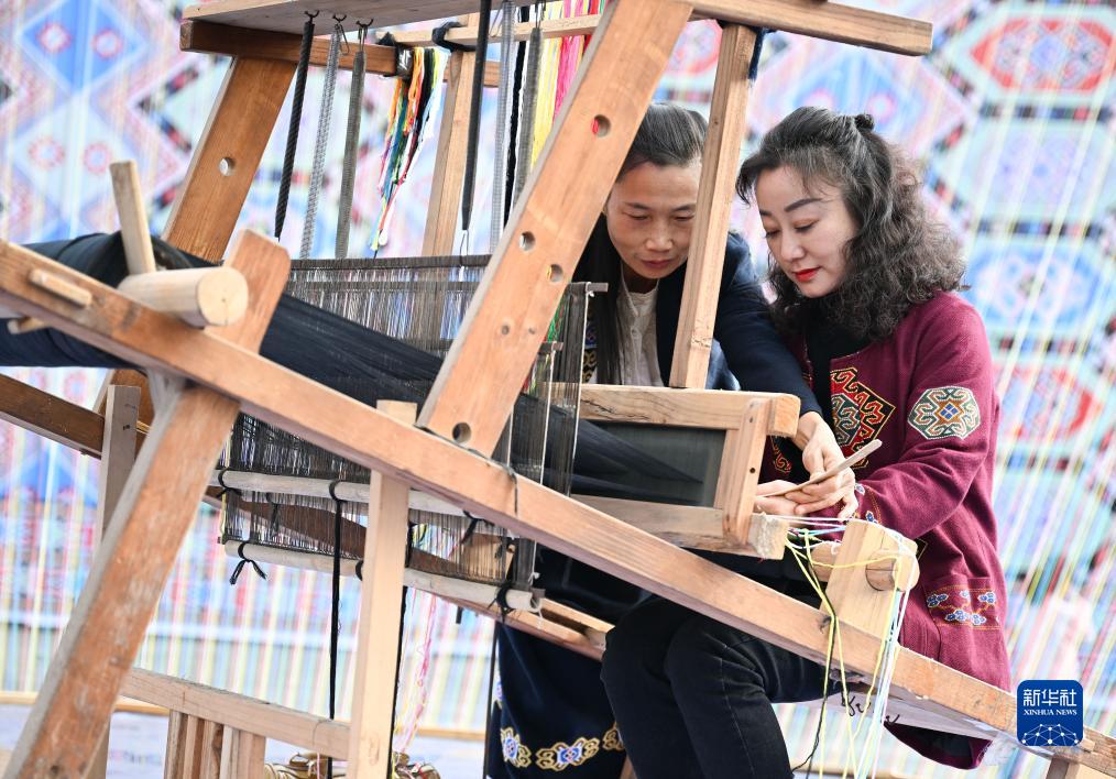 10月28日,織錦女工指導游客使用傳統織錦機進行“西蘭卡普”製作。