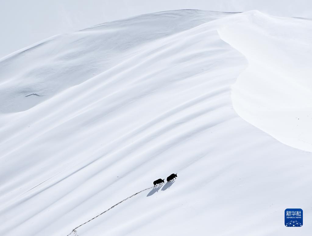 10月16日,在阿爾金山國家級自然保護區,野牦牛攀爬雪後的庫木庫裏沙漠。