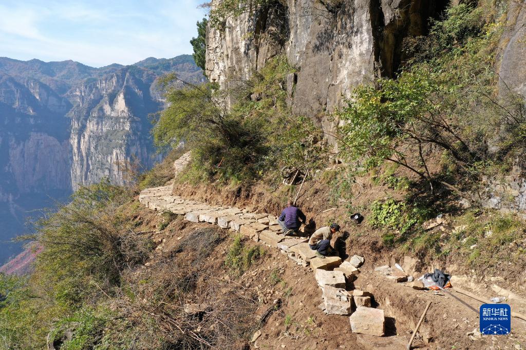 在壺關縣大峽谷鎮青龍峽村,村民們在山上修路(10月17日攝,無人機照片)。