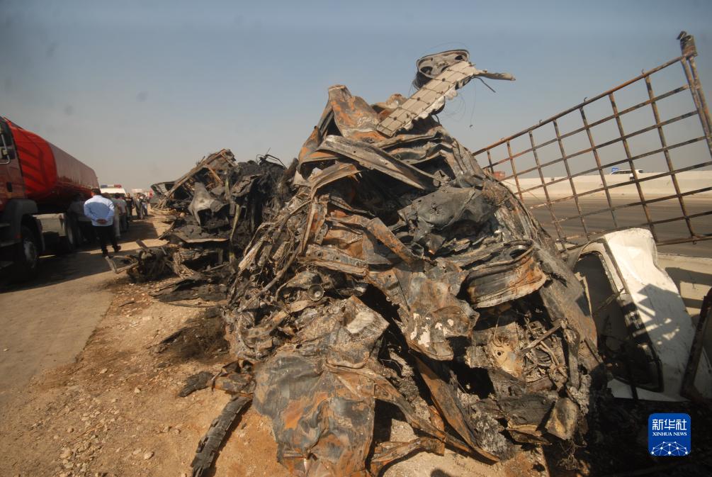 這是10月28日在埃及布海拉省的多車相撞事故現場拍攝的損毀車輛。
