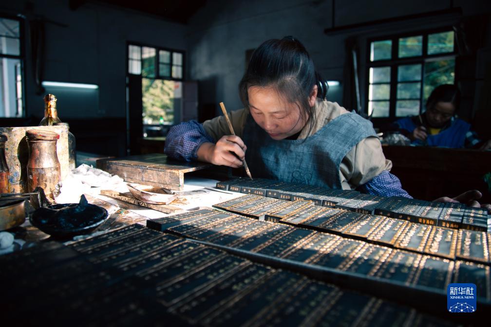 10月24日,在安徽省黃山市歙縣老胡開文墨業有限公司,工人在描金車間為晾制好的墨描金。