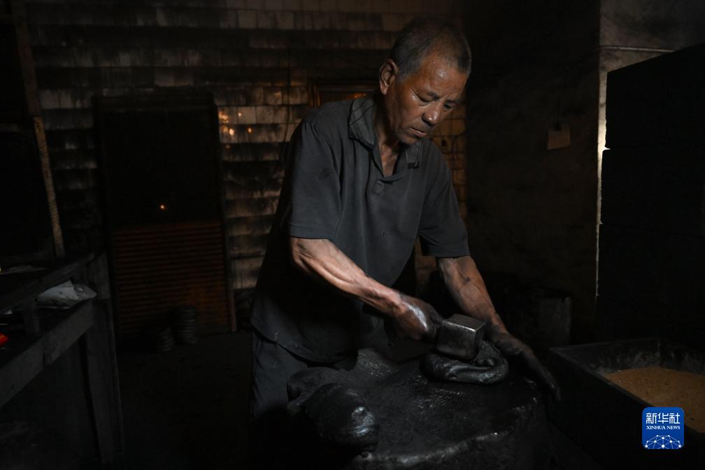 10月25日,在安徽省黃山市歙縣老胡開文墨業有限公司,工人將骨膠與煙灰混合後的墨泥錘打成墨餅。