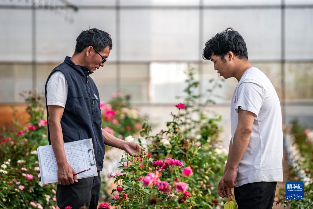 在雲南省安寧市現代農業園區玫瑰種植示範園,技術員田連通(左)在和同事交流(10月20日攝)。