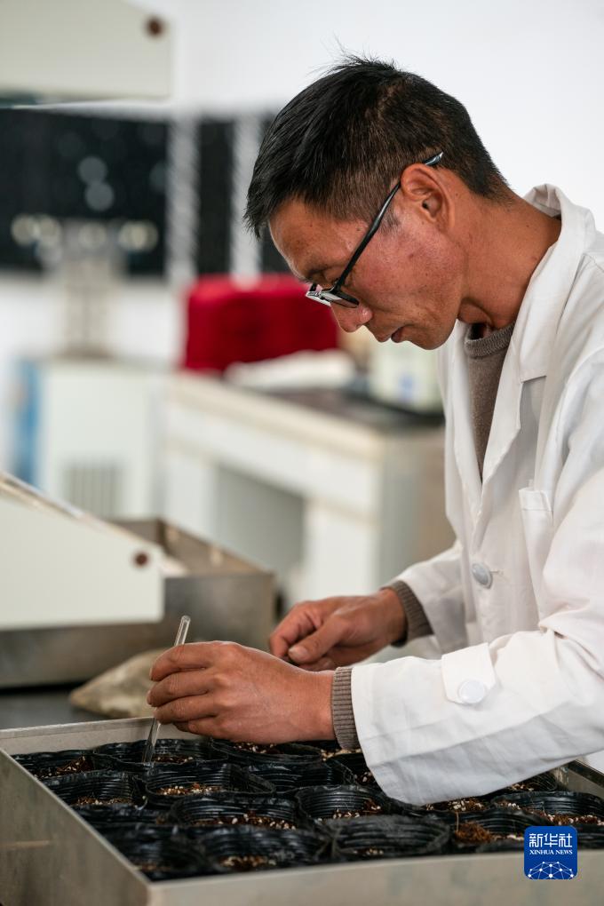 技術員田連通在實驗室播种太空種子(4月3日攝)。