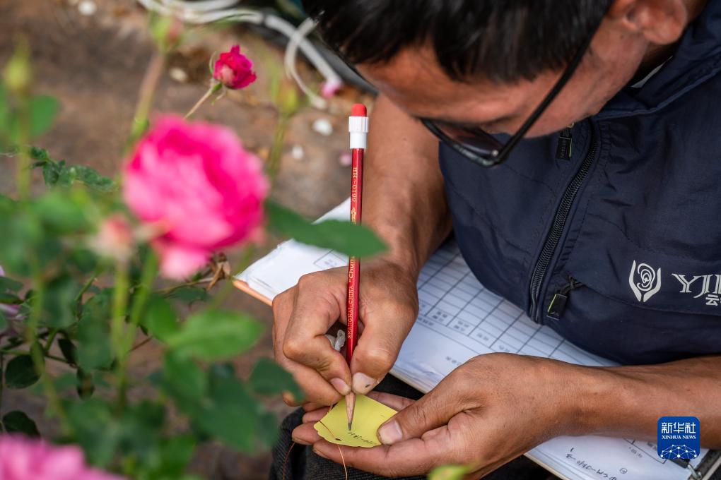 在雲南省安寧市現代農業園區玫瑰種植示範園,技術員田連通記錄玫瑰花編號(10月20日攝)。