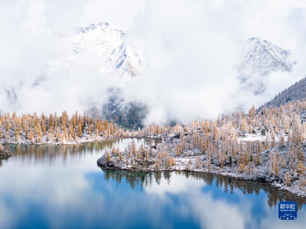雪山和黨嶺村葫蘆海、彩林構成一幅優美的畫卷(10月27日攝,無人機照片)。