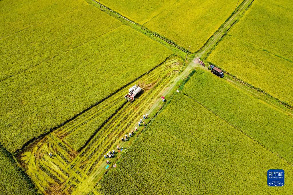 8月10日,在位於婁底市雙峰縣印塘鄉鹽井灣村的“稻再油”示範片,農機手駕駛收割機收割頭季稻穀(無人機照片)。