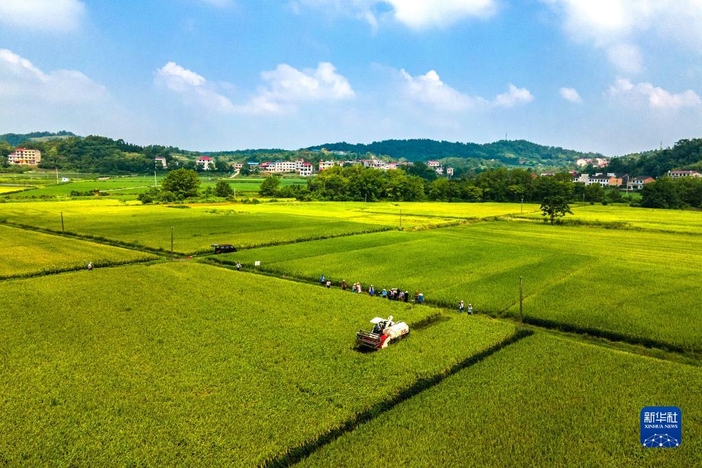 8月10日,在位於婁底市雙峰縣印塘鄉鹽井灣村的“稻再油”示範片,農機手駕駛收割機收割頭季稻穀(無人機照片)。