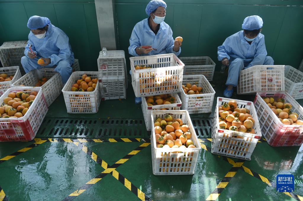 10月28日,村民在禹州市磨街鄉劉門村的加工廠裏篩選柿子。