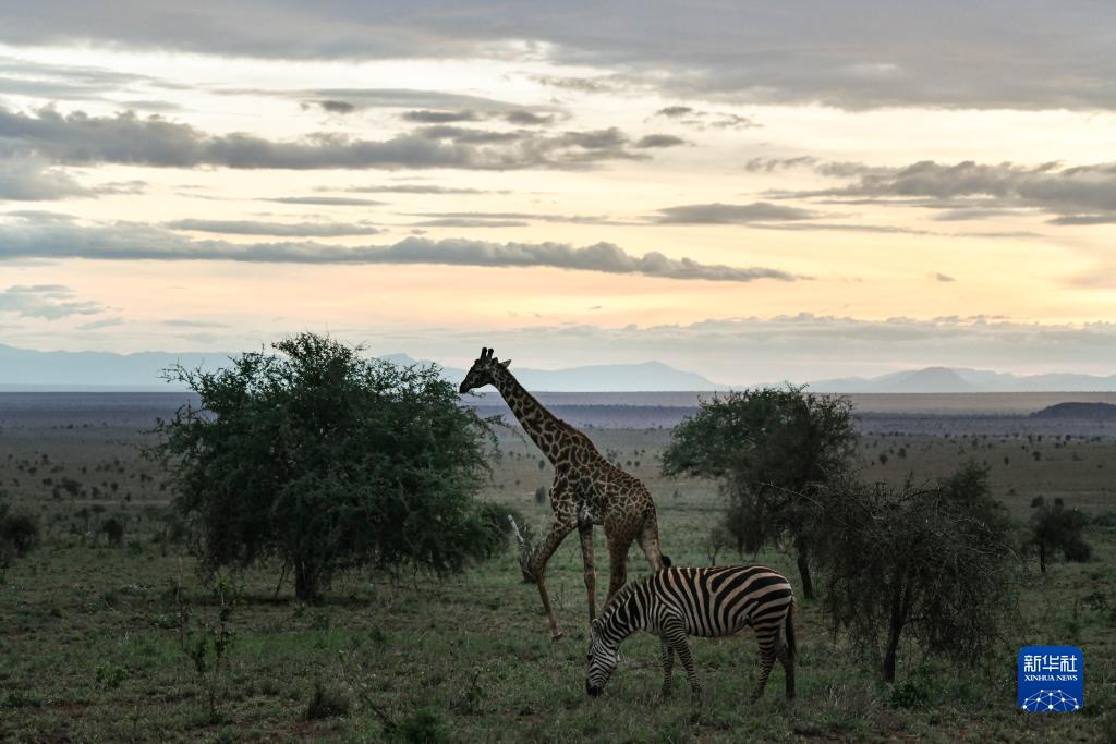10月27日,長頸鹿、斑馬在肯尼亞塔伊塔-塔韋塔郡泰塔山野生動物保護區內活動。
