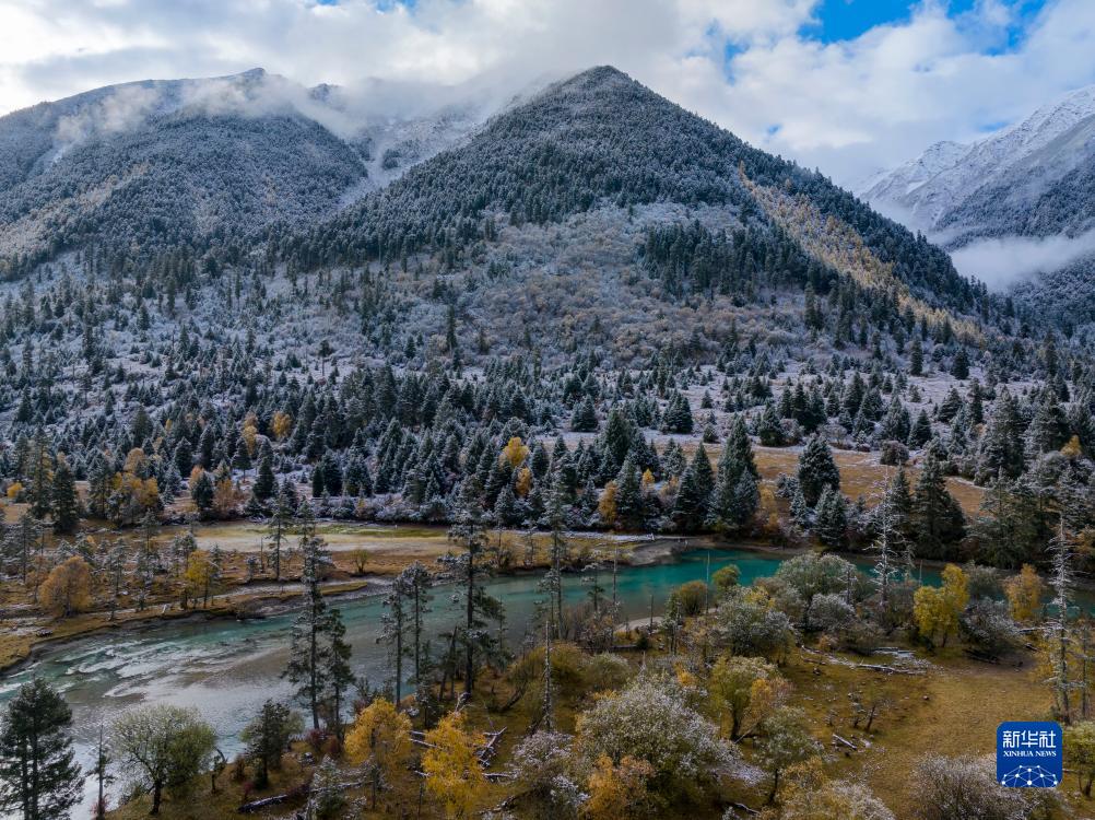 時值金秋,西藏林芝市秋色已濃,黃葉與初雪交織,流水並雪山輝映,景色如詩如畫。