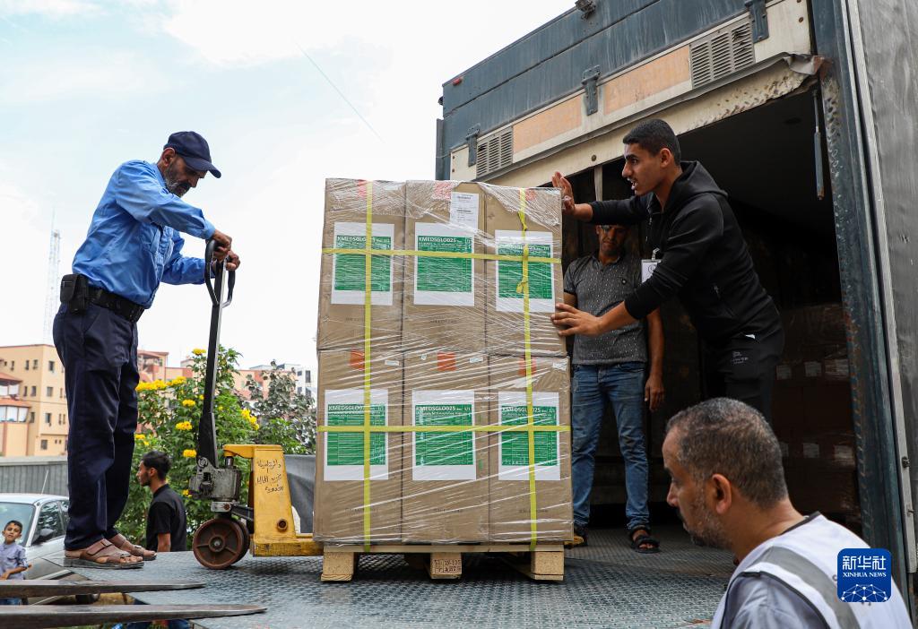 10月29日,工作人員在加沙地帶南部城市汗尤尼斯的一家醫院搬運醫療援助物資。
