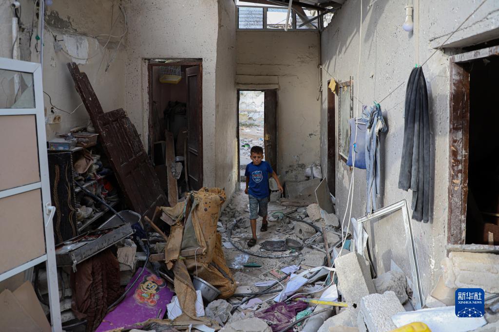 10月29日,在加沙地帶南部城市汗尤尼斯,一名兒童走在遭以色列襲擊損毀的建築中。