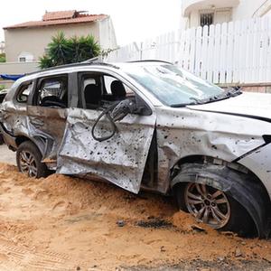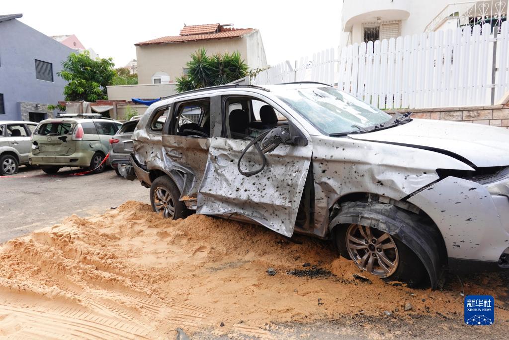這是10月29日在以色列南部城市阿什杜德拍攝的遭火箭彈襲擊的車輛。