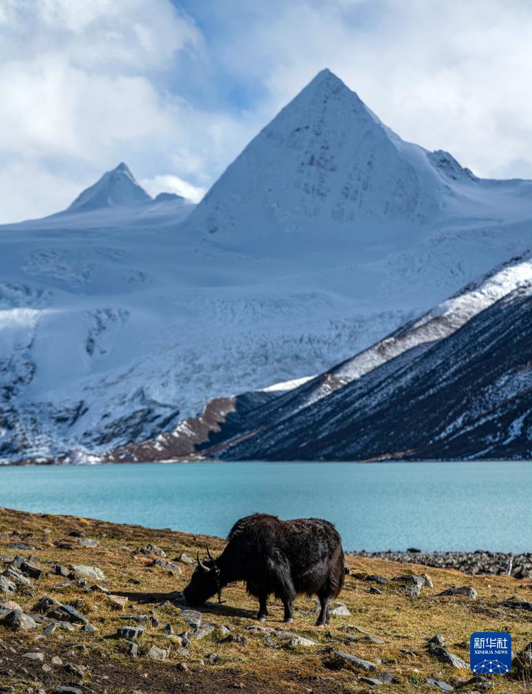 一頭牦牛在薩普雪山腳下的草場上吃草(10月28日攝)。