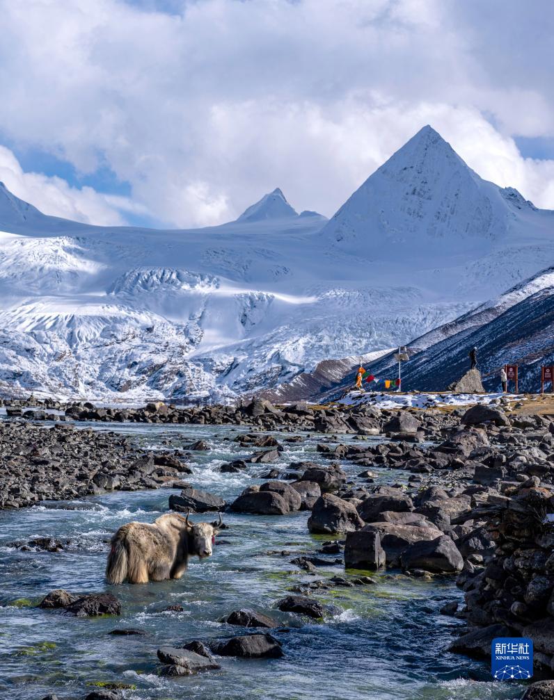 一頭牦牛站在薩普雪山腳下的河流裏(10月28日攝)。