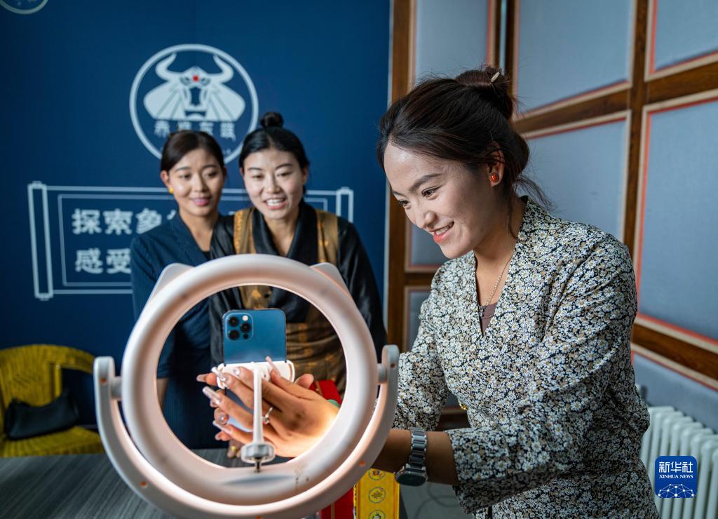 主播朗貢旺姆在巴青縣“赤堆東雄”網紅直播間調試直播設備(10月29日攝)。