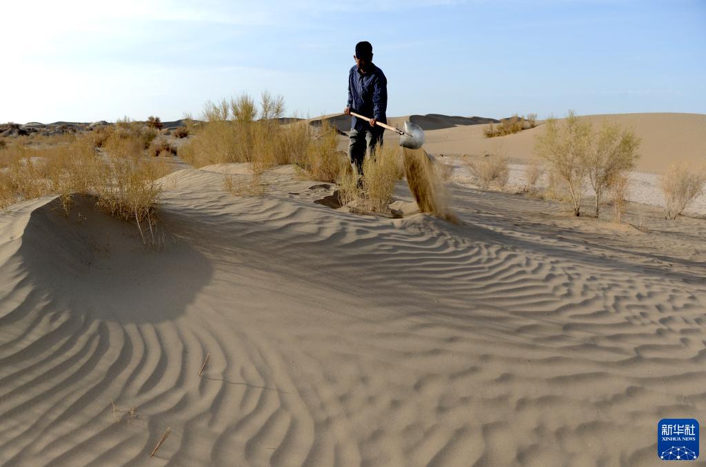 蘇和在內蒙古阿拉善沙漠栽植樹苗(2014年4月18日攝)。
