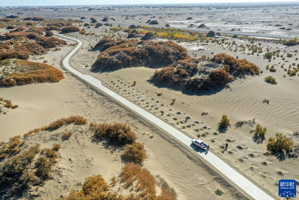 德力格給梭梭樹澆水(無人機照片,10月28日攝)。