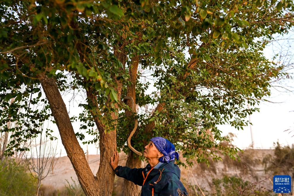 10月27日,德力格在查看當年和蘇和在這裡種下的第一棵樹。如今這棵樹已枝繁葉茂。