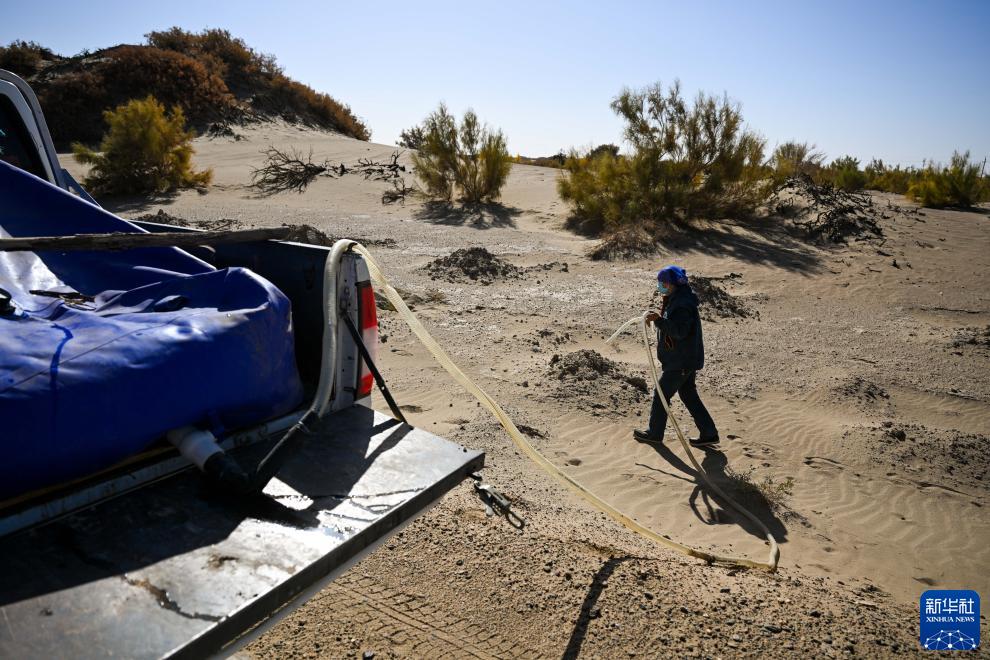 10月28日,德力格給梭梭樹澆水。