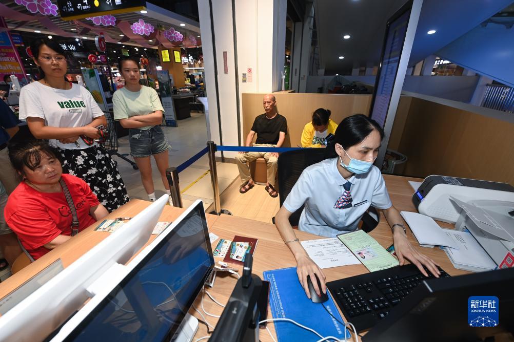2023年7月7日,市民在浙江省杭州市臨安區審管辦設置在一家超市裏的便民服務站辦理市民卡、社保等業務。在超市設置的便民服務站,將涉及市民卡、社保、醫保、公積金、個體工商等66項窗口辦理高頻事項納入服務內容,實行“一窗辦”“自助辦”“網上辦”“掌上辦”,打通便民服務“最後一公里”,實現政務服務“就近辦”,方便百姓就近辦事。