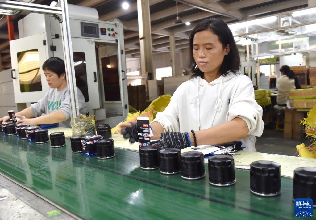 10月30日,威縣一家汽車濾芯生産企業工人在生産線上包裝産品。