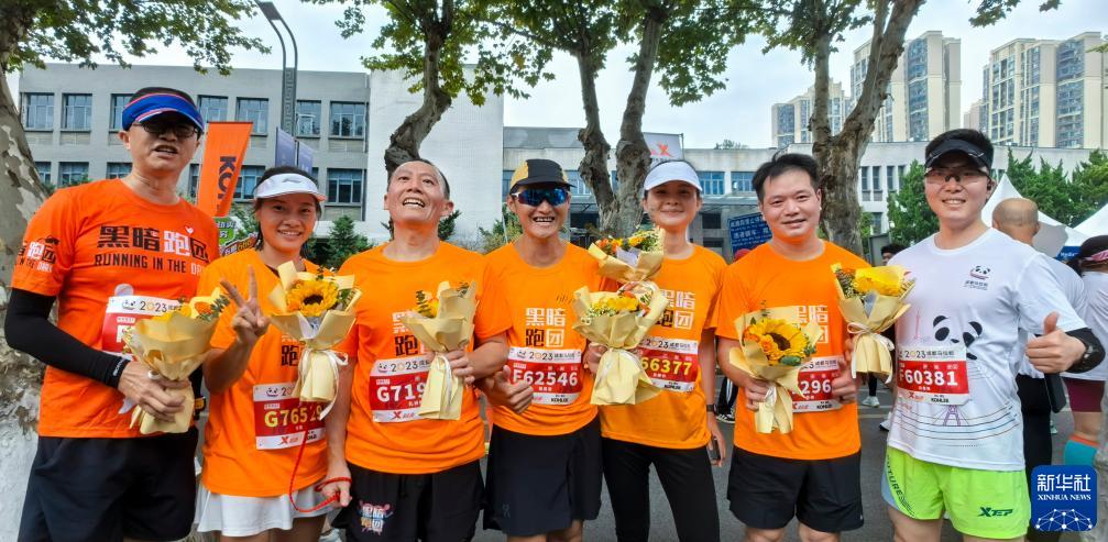 “黑暗跑團”視障跑者孔祥明(左三)完成2023成都馬拉松半程比賽後與陪跑志願者鄒曉海(左一)、方琪(左二)、張志宏、吉麗華、蘇航、白俊烽(右四至右一)合影(10月29日攝)。