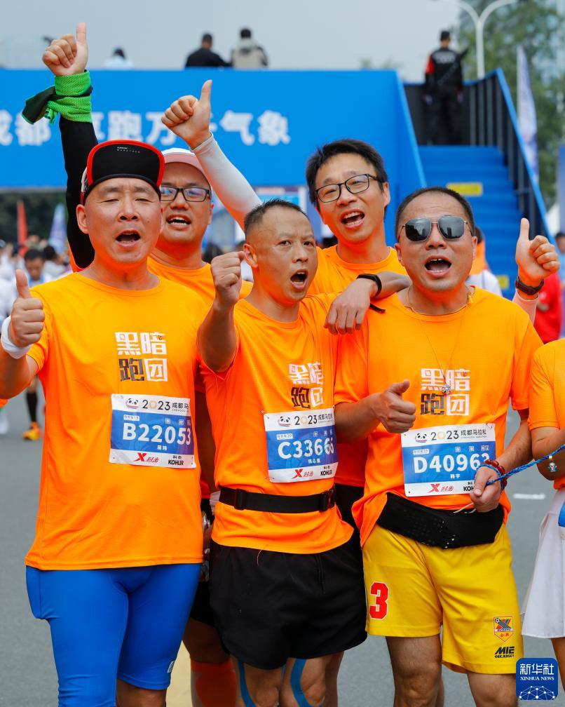 “黑暗跑團”視障跑者陳永強(中)、韓宇(右一)完成2023成都馬拉松全程比賽後與陪跑志願者歡呼慶祝(10月29日攝)。新華社記者 沈伯韓 攝