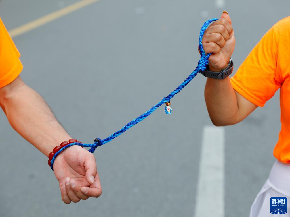 參加2023成都馬拉松全程比賽的“黑暗跑團”視障跑者韓宇(左)與他的陪跑志願者通過一根陪跑繩聯結在一起(10月29日攝)。新華社記者 沈伯韓 攝