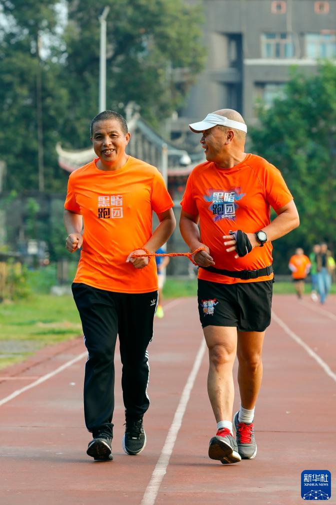 在四川大學華西校區運動場,“黑暗跑團”志願者謝蜀賢(右)用陪跑繩帶着視障跑者王克泉訓練(10月28日攝)。新華社記者 沈伯韓 攝