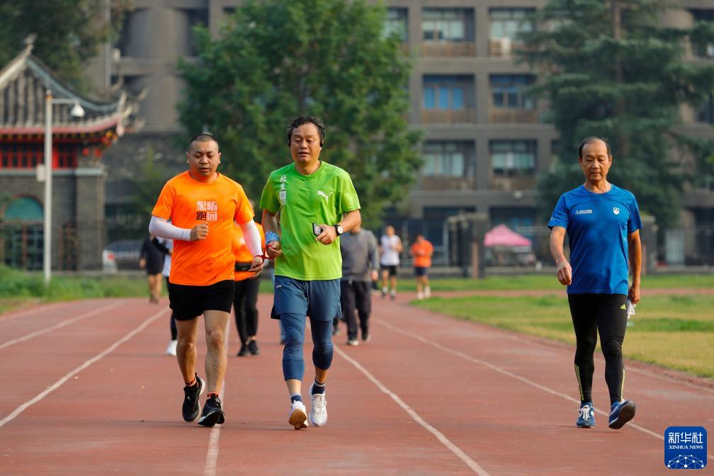 在四川大學華西校區運動場,“黑暗跑團”志願者用陪跑繩帶着視障跑者張華(前左一)訓練(10月28日攝)。新華社記者 沈伯韓 攝