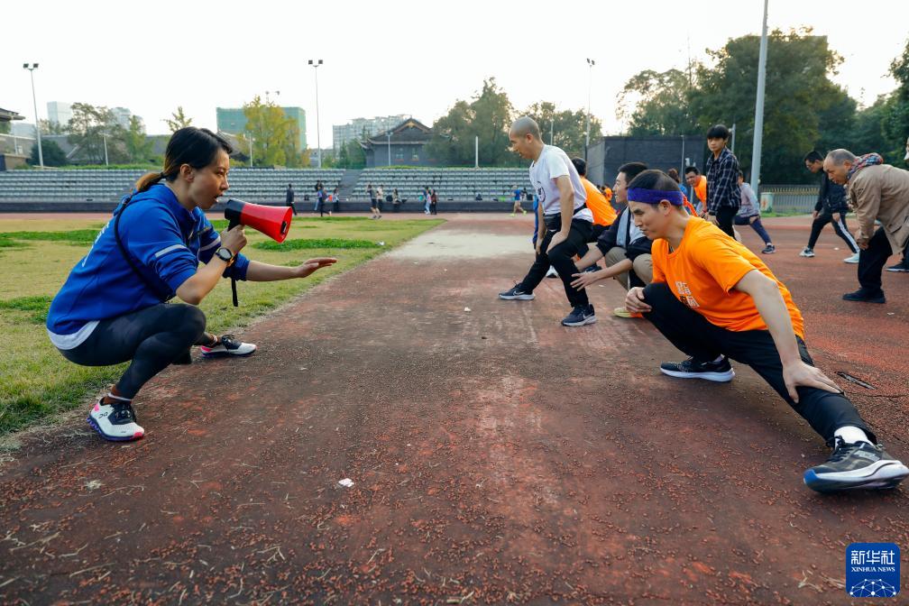 在四川大學華西校區運動場,“黑暗跑團”志願者陳霞(左一)帶領視障跑者和陪跑志願者在訓練前進行熱身活動(10月28日攝)。新華社記者 沈伯韓 攝
